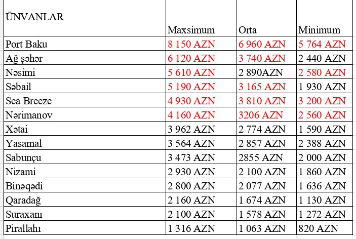 Bakıda mənzillərin ünvanlar üzrə maksimum, orta və minimum qiymətləri: 820 AZN - 8150 AZN