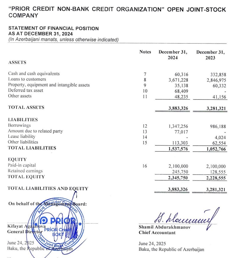 Ötən il "Prior Credit BOKT" ASC-nin kredit portfeli (müştərilərə verilmiş kreditlər) 824 min manat və ya 29% artaraq 31 dekabr 2024-cü il tarixinddə 3 milyon 671 min manata çatıb.