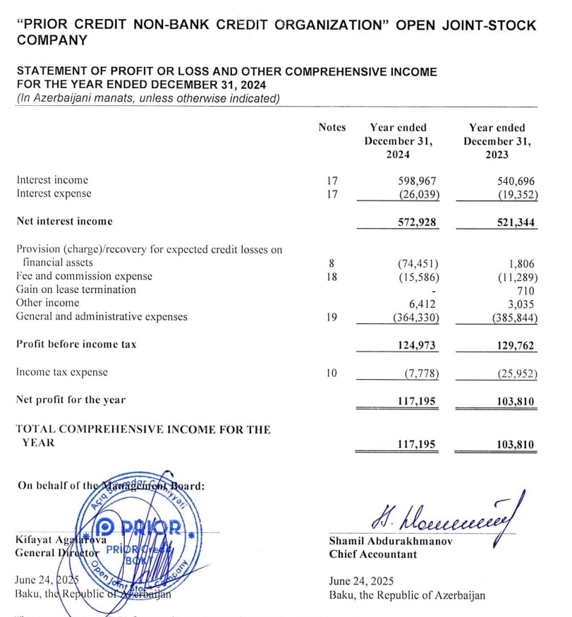 "Prior Credit BOKT" ASC 2024-cü ili 117 min manat xalis mənfəət ilə başa vurub. BOK 2023-cü ili 104 min manat xalis mənfəətlə bağlamışdı.