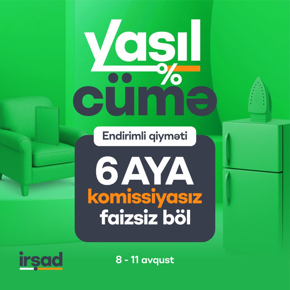 “Yaşıl Cümə” kampaniyası çərçivəsində “Irshad” mağazalar şəbəkəsində və onlayn platformalarında ev və şəxsi istifadə üçün elektronikadan məişət texnikasına, smartfonlardan aksessuarlara qədər yüzlərlə məhsulda 70%-dək böyük endirimlər tətbiq olunur.