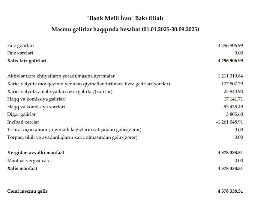 "Bank Melli İran" Bakı filialı 2025-ci ilin 9 ayını (yanvar-iyun) 4 milyon 378 min manat xalis mənfəət ilə başa vurub.