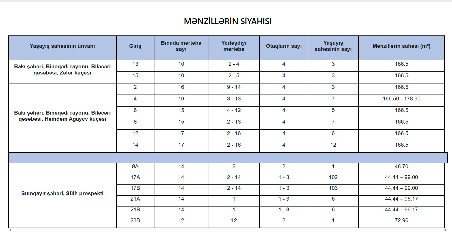 Marja.az Fonda istinadən xəbər verir ki, yeni mənzillər seçim üçün 20.11.2025-ci il tarixində saat 15:00-dan etibarən açıq olacaq. Vətəndaşlar təqdim olunan yaşayış sahələrinin siyahısı ilə bu keçid vasitəsilə tanış ola bilərlər.