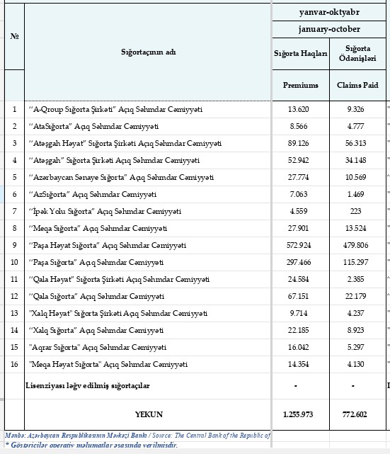 2025-ci ilin 10 ayı ərzində (yanvar-oktyabr) Azərbaycanda fəaliyyət göstərən 16 sığorta şirkəti tərəfindən 1 milyard 255 milyon 973 min manat sığorta haqları hesablanıb, 772 milyon 602 min manat sığorta ödənişləri həyata keçirilib.