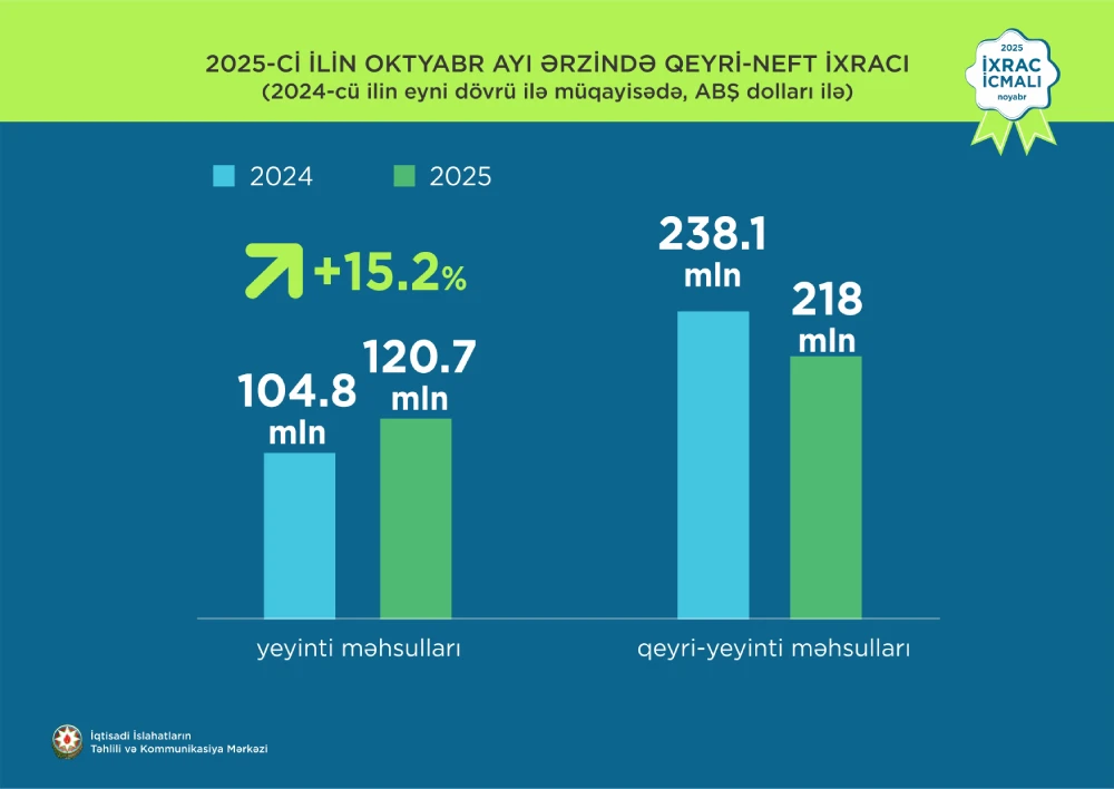 2025-ci ilin oktyabr ayı ərzində ixrac edilmiş qeyri-neft sektoruna aid malların siyahısında qızıl(38.9 milyon ABŞ dolları) birinci olub. Bu siyahıda xurma (32.7 milyon ABŞ dolları) ikinci, meşə fındığı (23,9 milyon ABŞ dolları) isə üçüncü yerdə qərarlaşıb.