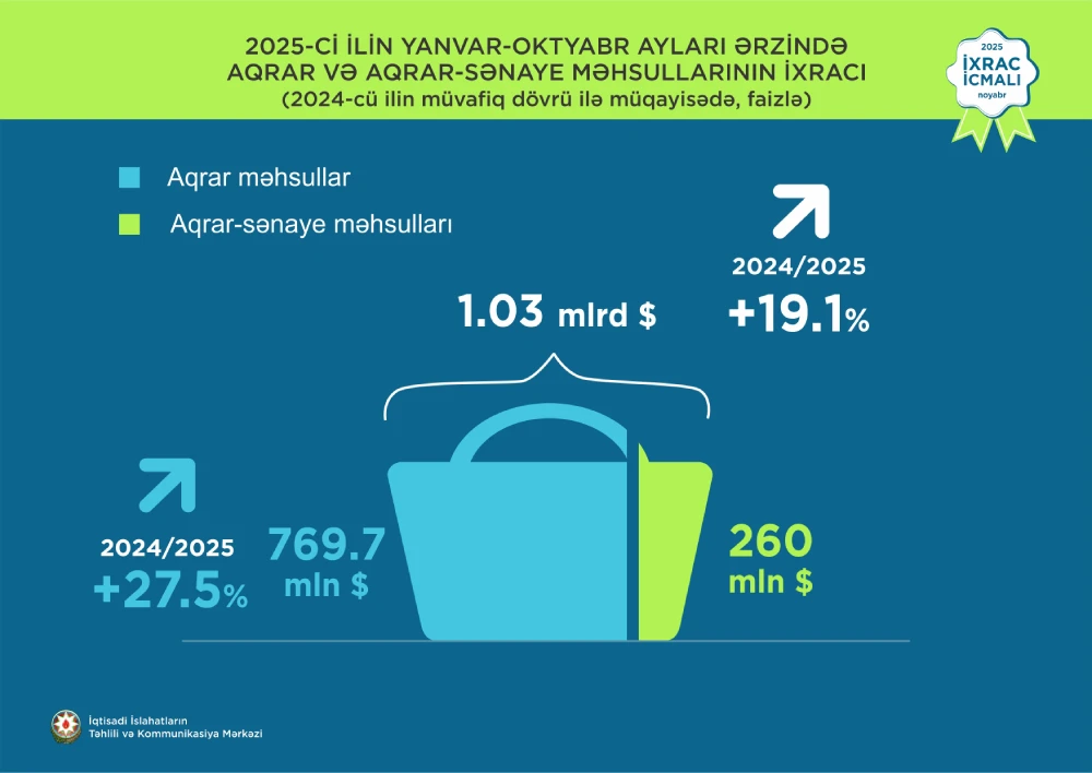 Cari ilin on ayında aqrar məhsullar üzrə ixrac 27,5% artaraq 769,7 milyon ABŞ dolları, aqrar-sənaye məhsulları üzrə ixrac isə 260 milyon ABŞ dollarına bərabər olub. Bütövlükdə aqrar və aqrar-sənaye məhsullarının birgə ixracı 19,1% artaraq 1.03 mlrd ABŞ dolları təşkil edib.
