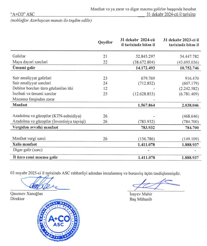 Spirtli və spirtsiz içkilərin istehsalı ilə məşğul olan "A+CO" ASC 2024-cü ili 1 milyon 411 min manat xalis mənfəət ilə başa vururb. Şirkət 2023-cü ili 1 milyon 889 min manat xalis mənfəət ilə bağlamışdı. Beləliklə, "A+CO" ASC şirkətinin xalis mənfəəti 2024-cü ildə 2023-cü illə müqayisədə 478 min manat və ya 25,3% azalıb.