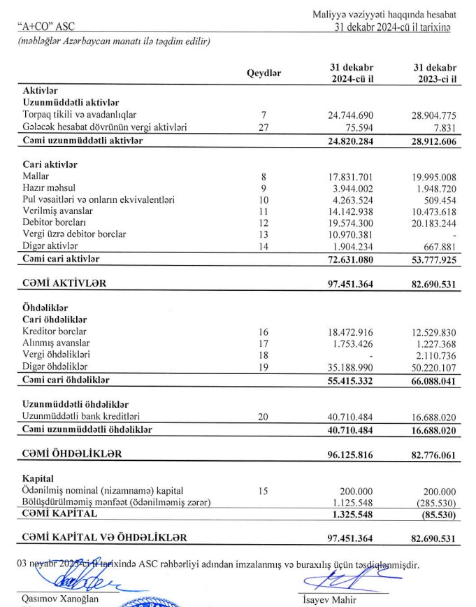 30 İyun 2025-ci il tarixində "A+CO" 97 milyon 332 min manat cəmi aktivlərə malik olub. Şirkət 2024-cü ilin sonunda 97 milyon 451 min manat cəmi aktivlər malik idi.