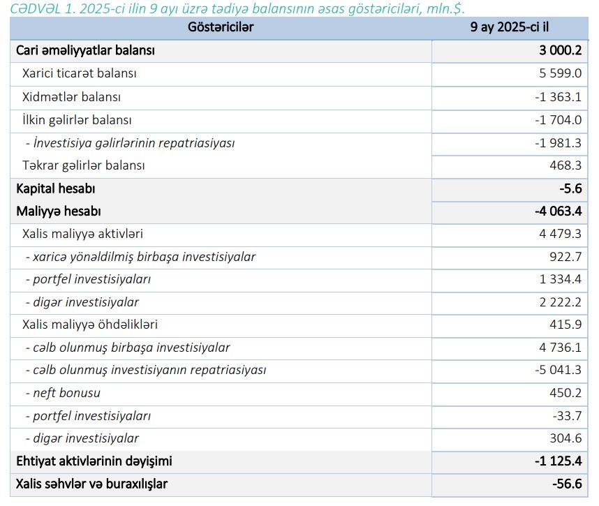 2025-ci ilin 9 ayında Azərbaycanın tədiyyə balansında 1 milyard 125,4 milyon dollar kəsir olub. 2024-cü ilin 9 ayı üzrə tədiyə balansında 181,6 milyon dollar profisit olmuşdu.2025-ci ilin 9 ayında tədiyə balansı1 qlobal əmtəə, xidmət və maliyyə bazarlarındakı qiymət və indekslərin dəyişkənliyindən təsirlənmişdir. Bu dövrdə cari əməliyyatlar balansında 3.0 mlrd.$ həcmində profisit formalaşmış, kapital və maliyyənin hərəkəti balansı üzrə xalis xarici maliyyə aktivləri 4.5 mlrd.$, xalis maliyyə öhdəlikləri isə 0.4 mlrd.$ artmışdır.
