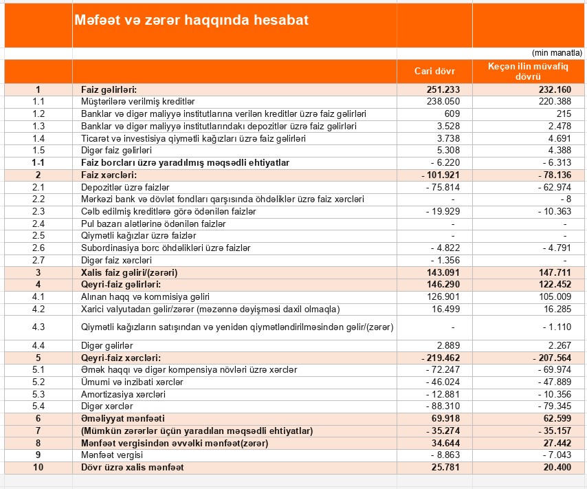 Qeyri-faiz gəlirləri isə 2025-ci ildə 146 milyon 290 min manat təşkil edib. 2024-cü ildə qeyri-faiz gəlirləri 122 milyon 452 min manat olmuşdu. Beləliklə, qeyri-faiz gəlirləri 23 milyon 838 min manat və ya 19,5 faiz artıb.