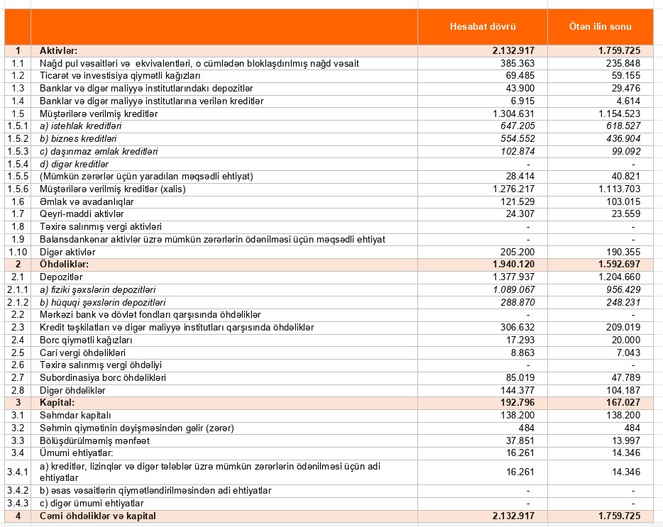 - daşınmaz əmlak kreditləri – 102 milyon 874 min manat (2024: 99 milyon 92 min manat), artım 3 milyon 782 min manat və ya 3,8 faiz təşkil edib.