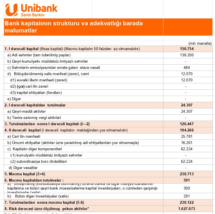 Unibankın məcmu kapitalı 2025-ci ilin sonuna 230 milyon 122 min manata çatıb. 2024-cü ilin sonunda bu göstərici 176 milyon 897 min manat idi. Ötən il Bankın məcmu kapital 53 milyon 225 min manat və ya 30,1 faiz artıb.