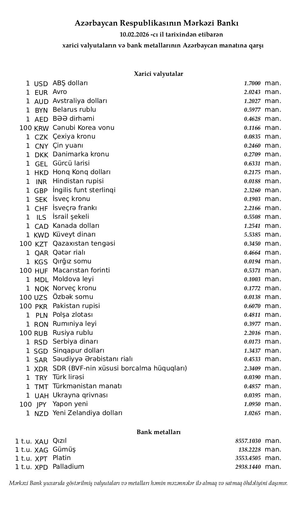 Rəsmi məzənnələr açıqlandı