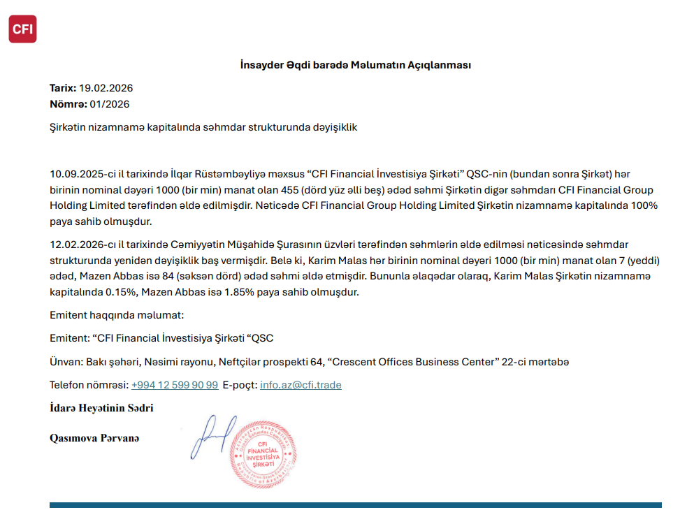 "CFI Financial İnvestisiya Şirkəti" QSC-nin yeganə səhmdarı, dünyanın aparıcı onlayn ticarət brokeri - "CFI Financial Group" payını 100 %-dən 98 %-ə endirib.