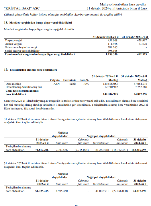31 dekabr 2024-cü il tarixində "Kristal Bakı" ASC-nin təsisçilərindən alınmış borc öhdəlikləri 142 milyon 317 min manat təşkil edib. Bu məbləğ 2023-cü ilin sonunda 74 milyon 817 min manat idi.