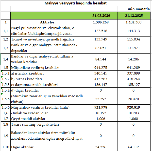 "Rabitəbank"ın cəmi aktivləri 2025-ci ilin sonu ilə müqayisədə 7 milyon 30 min manat və ya 0,5% azalaraq 1 milyard 395 milyon 269 min manata düşüb. Bankın kredit portfeli isə (müştərilərə verilmiş kreditlər) 2 milyon 986 min manat və ya 0,3% artaraq 944 milyon 275 min manata çatıb.
