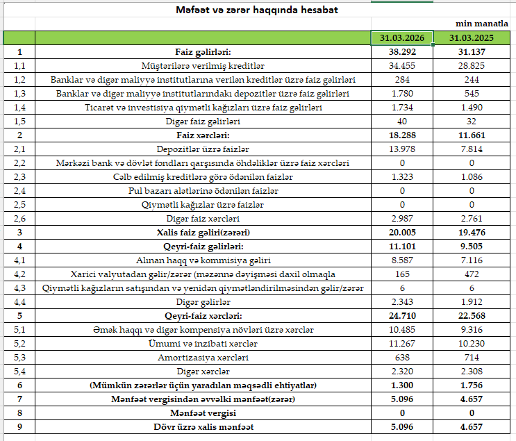 Müqayisə üçün qeyd edək ki, 2025-ci ilin ilk rübündə "Rabitəbank"ın cəmi əməliyyat gəlirləri 40 milyon 642 min manat, cəmi əməliyyat xərcləri 34 milyon 229 min manat təşkil etmişdi. Bank 6 milyon 413 min manat əməliyyat mənfəətindən 1 milyon 756 min manat mümkün zərərlər üçün yaradılan məqsədli ehtiyatlara ayırmışdı.