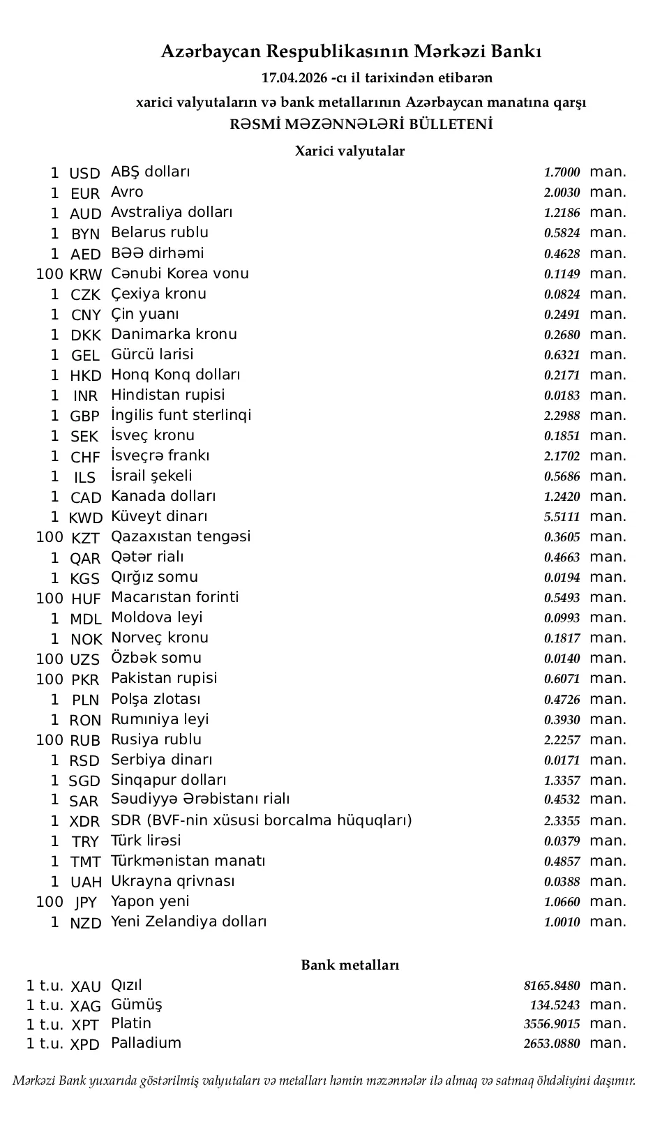 Dolların bazar ertəsi üçün rəsmi məzənnəsi müəyyən olunub