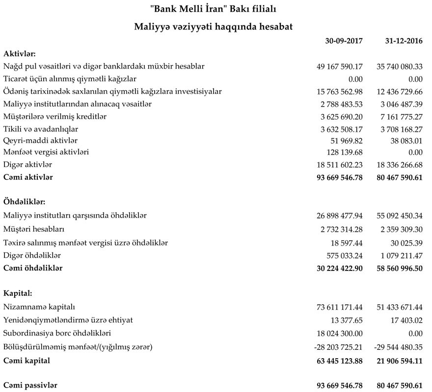 Halbuki, Bank 2016-cı ilin eyni dövründə 15 milyon 370 min manat zərər etmişdi. Zərərin yaranmasının səbəbi aktivlər üzrə ehtiyatların yaradılmasına 16 milyon 873 min manat ayrılması idi. "Bank Melli İran" Bakı filialının lisenziyası ləğv edilmiş banklarda depozitləri qalıb. Bu səbəbdən filial qaydalara uyğun olaraq böyük ehtiyat yaratmaq məcburiyyətində qalmışdı.