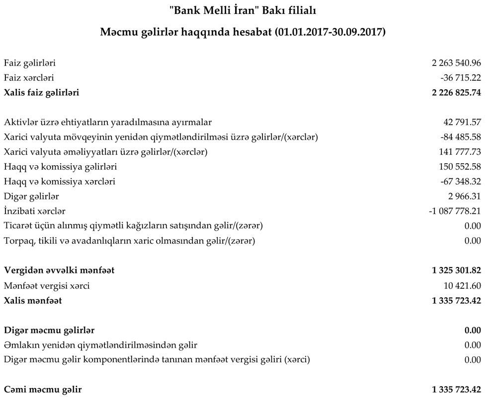 "Bank Melli İran" Bakı filialı 2017-ci ilin 9 ayını 1 milyon 336 min manat xalis mənfəətlə başa vurub.