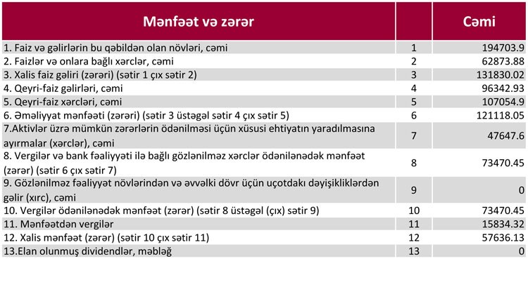Əməliyyat mənfəətindən 15 milyon 834 min manat mənfəət vergisi ödənilib. Nəticədə də Bankın 57 milyon 636 min manat xalis mənfəəti qalıb.