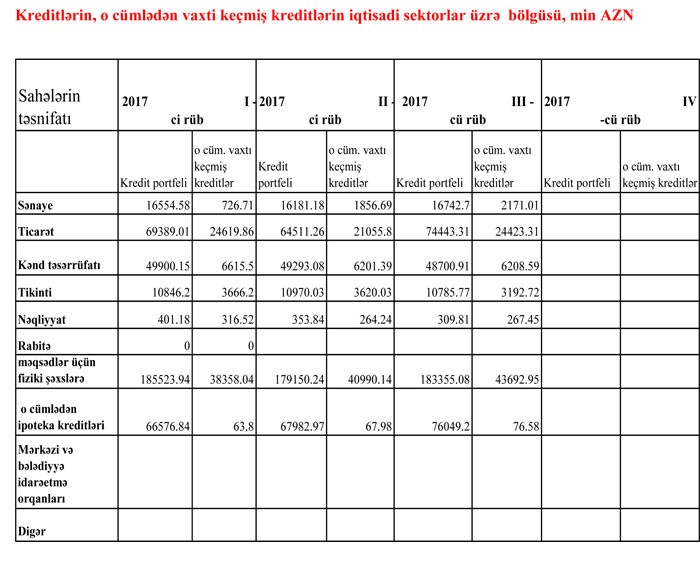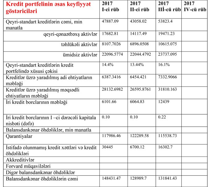 Qeyri-standart kreditlərin 19 milyon 471 min manatı “qeyri-qənaətbəxş”, 10 milyon 615 min manatı “təhlükəli” və 23 milyon 737 min manatı “ümidsiz” hesab olunur.