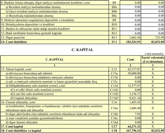 Bank ötən ilin sonunda 132 milyon 195 min manat cəmi aktivlərə, 71 milyon 566 min manat cəmi öhdəliklərə və 60 milyon 630 min manat cəmi balans kapitalına malik idi.