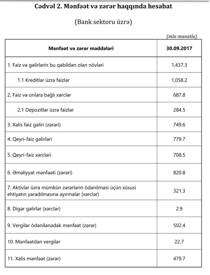 2017-ci ilin 30 sentyabr tarixinə olan bank sektorunun əsas göstəriciləri bank sektorunun icmal göstəricilərində öz əksini tapmışdır.