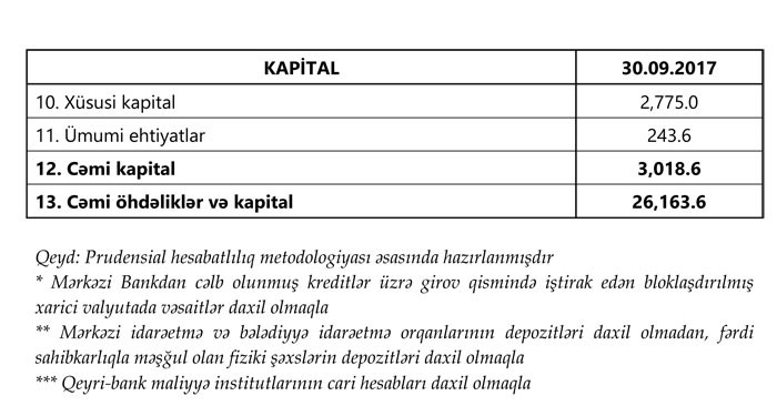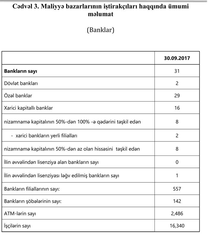 Azərbaycanda fəaliyyət göstərən 31 bankın 30 sentyabr 2017-ci il tarixinə cəmi aktivləri 26 milyard 163.6 milyon manat, cəmi öhdəlikləri isə 23 milyard 145 milyon manat təşkil etmişdir. Sektorun balans kapitalı 3 milyard 18.6 milyon manat, əhalinin əmanətləri 6 milyard 999.5 milyon manat olmuşdur. Bu barədə "Marja"ya Maliyyə Bazarlarına Nəzarət Palatasından bildirilib.