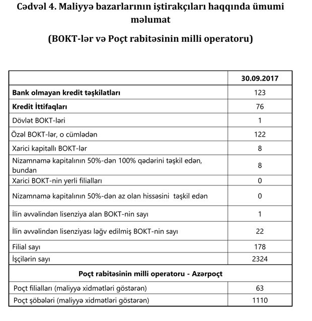 Hazırda ölkədə fəaliyyət göstərən 123 Bank olmayan kredit təşkilatlarının 178 filialında 2324 nəfər işçi çalışır.