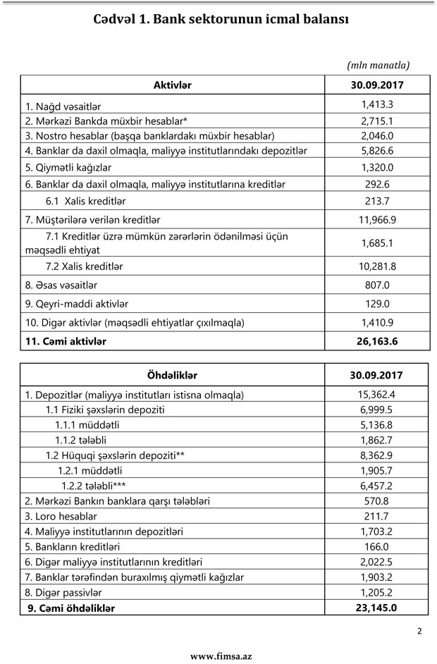 31 bankın 30 sentyabr 2017-ci il tarixinə müştrilərə verdiyi kreditllər 11 milyard 967 milyon manat təşkil edib. Bu barədə "Marja"ya Maliyyə Bazarlarına Nəzarət Palatasından bildirilib.