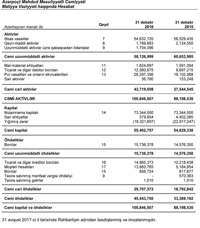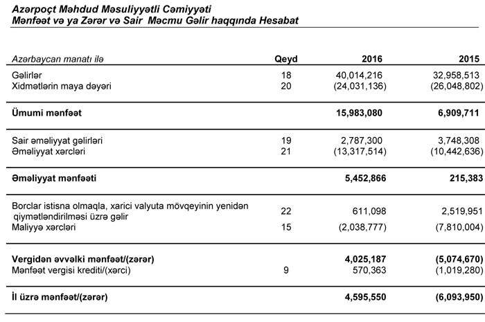 2016-cı ildə şirkətin göstərdiyi xidmətlərdən gəliri 40,014 mln. manat (2015-ci ilə nisbətən 21,4% çox), xidmətlərinin maya dəyəri 24,031 mln. manat (7,75% az), sair əməliyyat gəlirləri 2,787 mln. manat (25,4% az), əməliyyat xərcləri 13,318 mln. manat (27,5% çox), borclar istisna olmaqla xarici valyuta mövqeyinin yenidən qiymətləndirilməsi üzrə gəlirləri 611 min manat (75,75% az), maliyyə xərcləri 2,039 mln. manat (73,9% az) təşkil edib. Son nəticədə, ötən il milli poçt operatorunun vergiöncəsi mənfəəti 4,025 mln. manat olub (əvvəlki il – 5,075 mln. manat zərər olub).