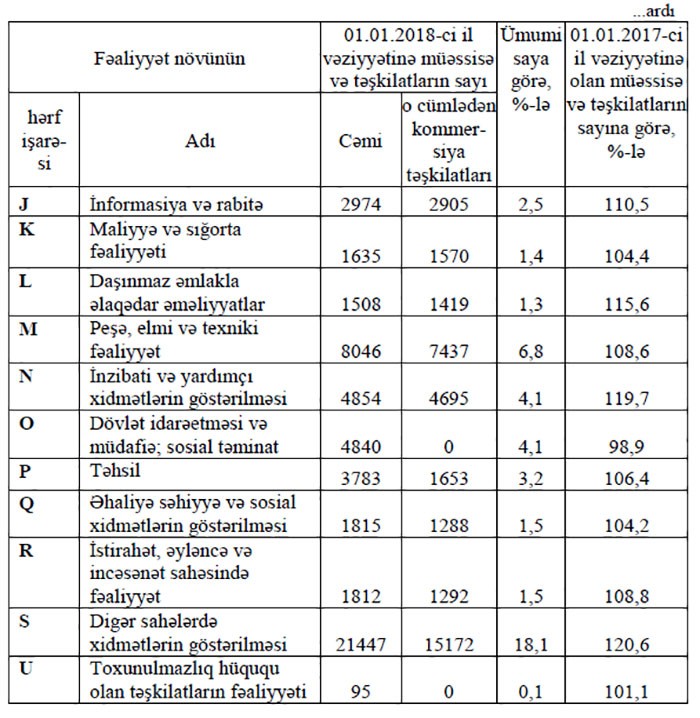 “Ticarət; nəqliyyat vasitələrinin təmiri”, “Digər sahələrdə xidmətlərin göstərilməsi”, “Tikinti”, “Kənd təsərrüfatı, meşə təsərrüfatı və balıqçılıq” və “Peşə, elmi və texniki fəaliyyət” sahələrində müəssisə və təşkilatların statistik vahidlərin Dövlət reyestrindəki xüsusi çəkisi daha yüksək olmuşdur.