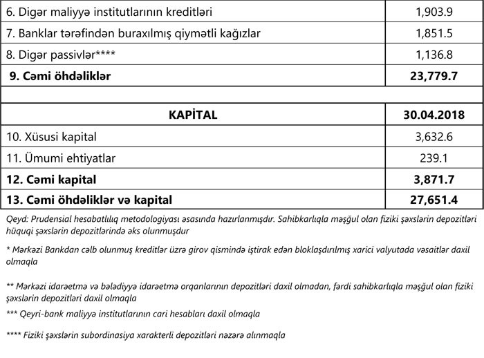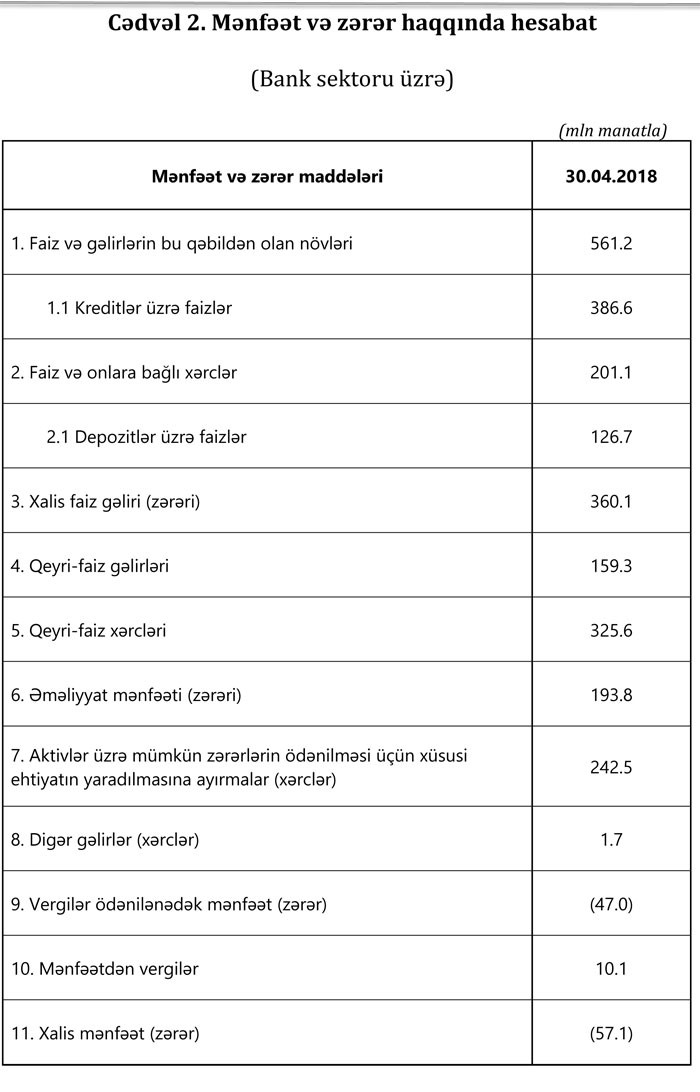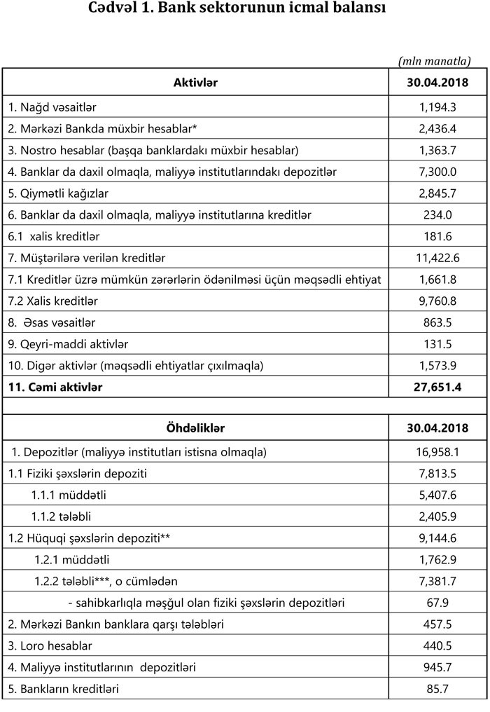 30 aprel 2018-ci il tarixinə bank sektorunun əsas göstəriciləri bank sektorunun icmal göstəricilərində öz əksini tapıb.