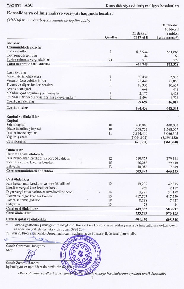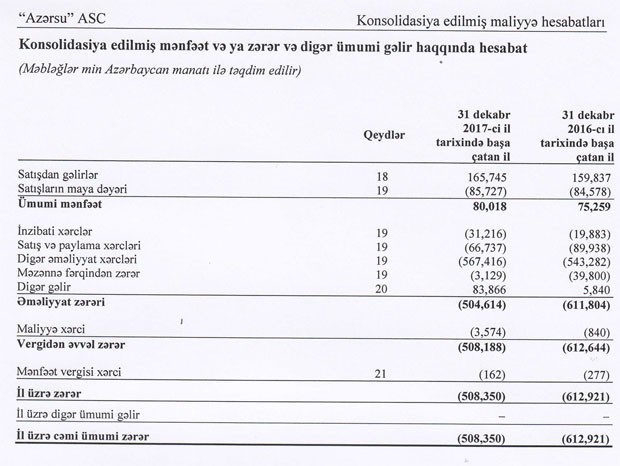 “İnfrastruktur layihələrində əhəmiyyətli cari investisiyalar nəticəsində "Azərsu"nun cari öhdəlikləri cari aktivlərindən 31 dekabr 2017-ci və 2016-cı il tarixlərinə, müvafiq olaraq, 370 milyon 158 min manat və 457 milyon 875 min çox olmuşdur. "Azərsu" 31 dekabr 2017-ci il tarixində başa çatan il üzrə 508 milyon 350 min manat (2016-cı il 612 milyon 921 min manat) məbləğində xalis zərər çəkmişdir. "Azərsu" su təchizatı və kanalizasiya xidmətləri üzrə dövlət inhisarının bir hissəsidir və Dövlət "Azərsu"nun cari investisiya layihələri ilə yanaşı fəaliyyətinə kömək etmək məqsədi ilə maliyyələşdirməni davam etdirir”,- Hesabatda deyilir.
