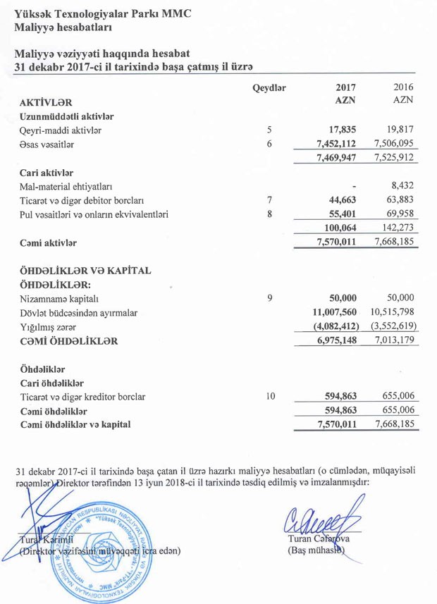 "Yüksək Texnologiyalar Parkı" MMC 2017-ci ili 529 min 793 manat zərər ilə başa vurub. Müqayisə üçün qeyd edək ki, 2016-cı ildə MMC-nin zərəri 983 min 492 manat təşkil etmişdi.