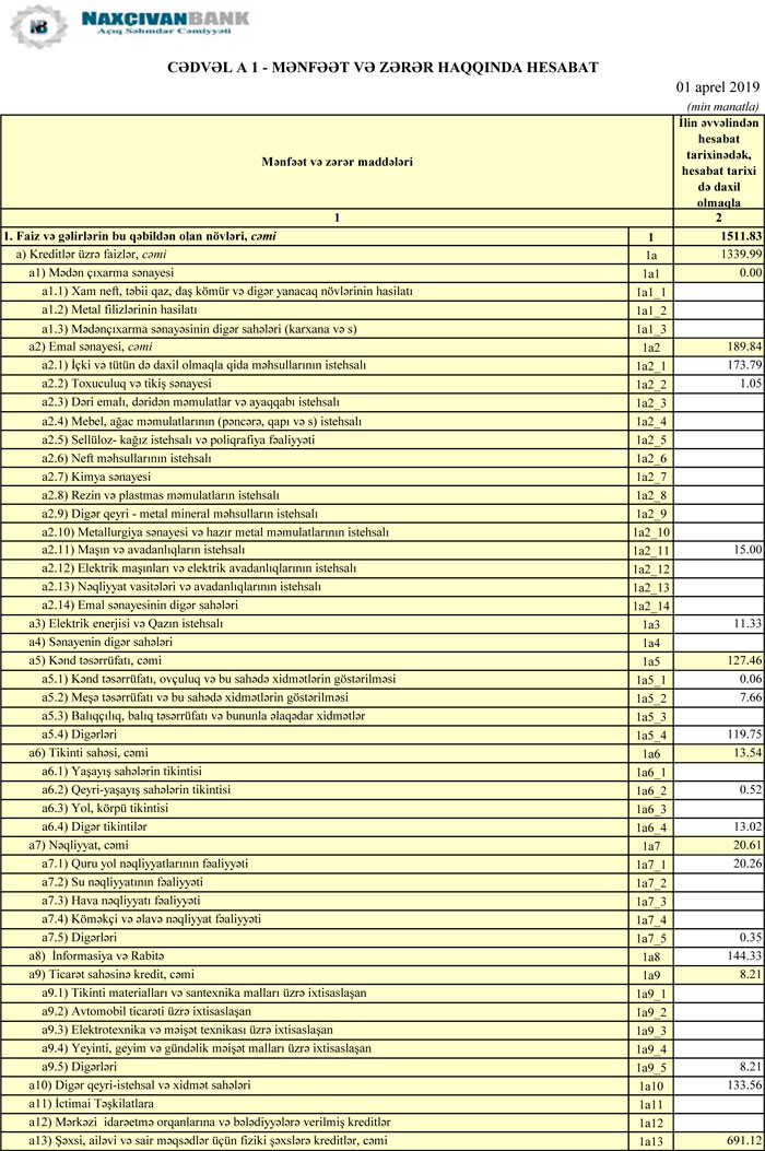 “Naxçıvanbank” ASC 2019-cu ilin 1-ci rübünü 1 milyon 117 min manat xalis mənfəətlə başa vurub. Halbuki, Bank 2018-ci ilin 1-ci rübünü 853 min manat xalis mənfəət ilə bağlamışdı. Beləliklə, “Naxçıvanbank”ın xalis mənfəəti 31% artıb.