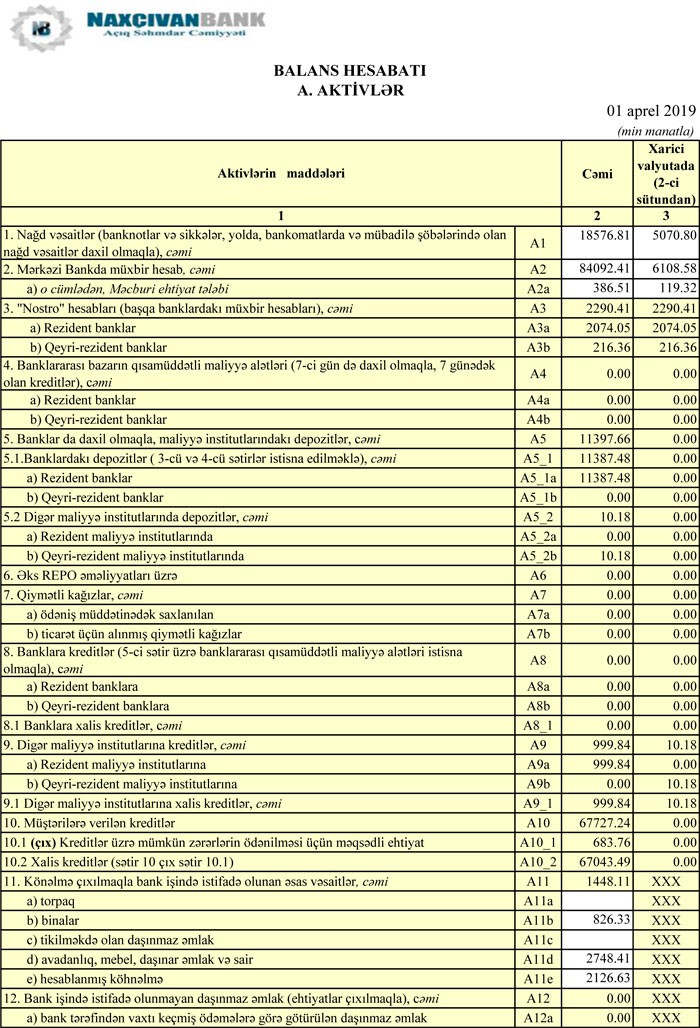 31 Mart 2019-cu il tarixində "Naxçıvanbank" 191 milyon 952 min manat cəmi aktivlərə malik olub. Aktivlərin 67 milyon 727 min manatını müştərilərə verilən kreditlər təşkil edib. 31 Dekabr 2018-ci il tarixində Bankın cəmi aktivləri 196 milyon 541 min manat, o cümlədən müştərilərə verilən kreditlər 64 milyon 854 min manat təşkil etmişdi.