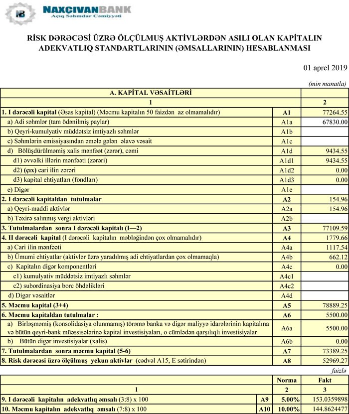 Ötən ilin yanvar-mart dövründə Bankın cəmi gəlirləri 2 milyon 61 min manat, əməliyyat mənfəəti 1 milyon 201 min manat təşkil etmişdi. Əməliyyat mənfəətinin 348.62 min manatı aktivlər üzrə mümkün zərərlərin ödənilməsi üçün xüsusi ehtiyatın yaradılmasına ayırılmışdı.