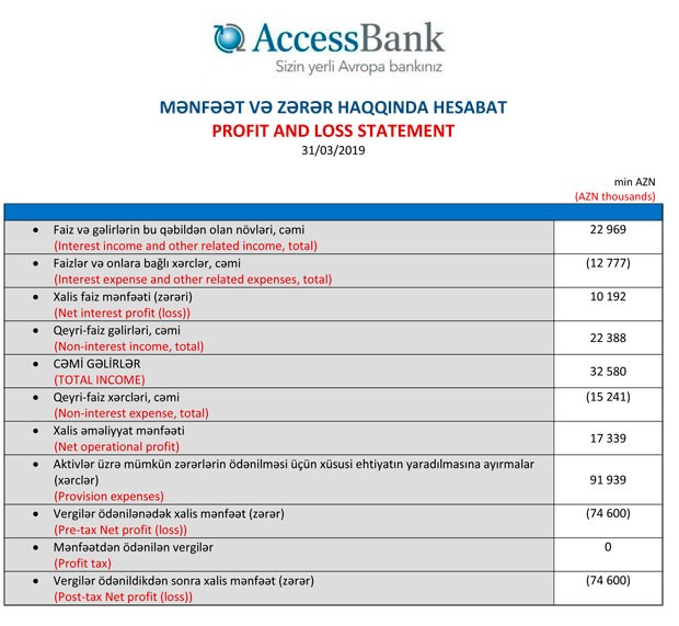 Daha əvvəl menecmentin də proqnozlaşdırdığı kimi, bank cari ilin ilk rübündə əməliyyat zərərini mənfəətə çevirə bilib. Martın sonuna AccessBank-ın xalis əməliyyat mənfəəti 17,339 mln. manat təşkil edib".