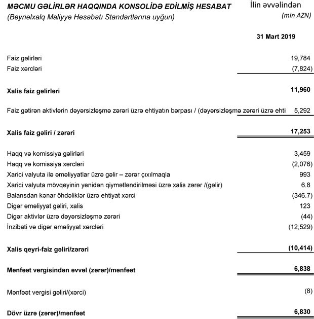 “Marja” Bankın maliyyə göstəricilərinə istinadən xəbər verir ki, 2019-cu ilin yanvar – mart dövründə “Unibank”ın cəmi gəlirləri (faiz və qeyri faiz gəlirləri) 24 milyon 366 min manat, cəmi xərcləri 22 milyon 820 min manat təşkil edib. Cəmi gəlirlər cəmi xərcləri üstələdiyindən “Unibank”ın 1 milyon 546 min manat əməliyyat mənfəəti formalaşıb. Eyni zamanda, ehtimal olunan kredit zərərləri üçün yaradılmış ehtiyatın 5 milyon 292 min manatı azad olduğundan Bankın mənfəəti 6 milyon 838 min manata yüksəlib. Bank 8 min manat mənfəət vergisi ödəyib.