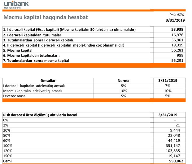 31 Mart 2019-cu il tarixində "Unibank" 55 milyon 291 min manat məcmu kapitala malik olub.