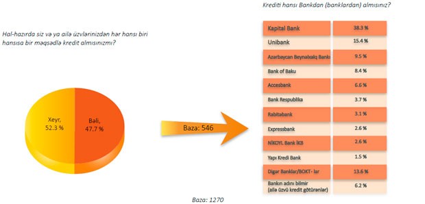 "Demək olar ki, Azərbaycan ailələrinin yarısı müxtəlif növ kreditlərdən istifadə edir (48%). Kreditlərdən istifadə edənlərin isə əksəriyyətinin "Kapital Bank"ın müştərisi olduğu aşkarlanıb. Sıralamada ikinci yeri "Unibank" tutur.