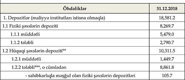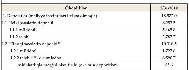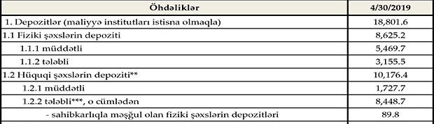 Müqayisə üçün qeyd edək ki, 2018-ci ilin sonunda fiziki şəxslərin depozitləri 8 milyard 270 milyon manat, o cümlədən müddətli depozitlər 5 milyard 479 milyon manat, tələbli depozitlər 2 milyard 791 milyon manat təşkil etmişdi. Ötən ilin sonu ilə müqayisədə ilk 4 ayda müddətli depozitlər 7 milyon manat azalıb.