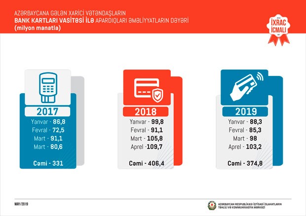 2019-cu ilin yanvar-aprel ayları ərzində Azərbaycana gələn xarici vətəndaşların bank kartları vasitəsi ilə apardıqları əməliyyatların dəyəri 375 milyon manat olub.