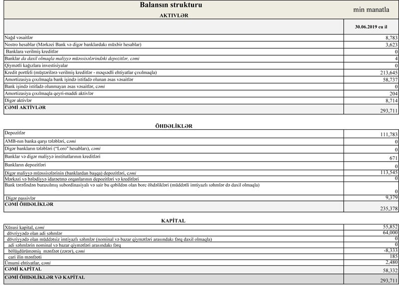 Ötən ilin sonunda 283 milyon 376 min manat təşkil etmiş cəmi aktivlər iyunun sonunda 293 milyon 711 min manata yüksəlib.