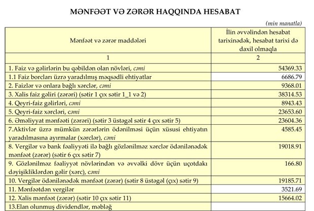Bank ilk 6 ayda 15 milyon 660 min manat xalis mənfəət əldə edib. Bu göstərici ötən ilin anoloji dövrü ilə müqayisədə 27.16% çoxdur.