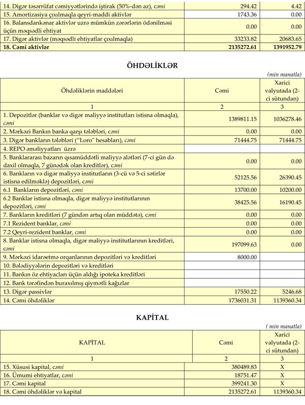 Qeyd edilib ki, Bankın aktivləri 2019-cu ilin altı ayı ərzində 6.33% artaraq 30 İyun 2019-cu il tarixində 2 milyard 135 milyon 270 min manat təşkil edib.