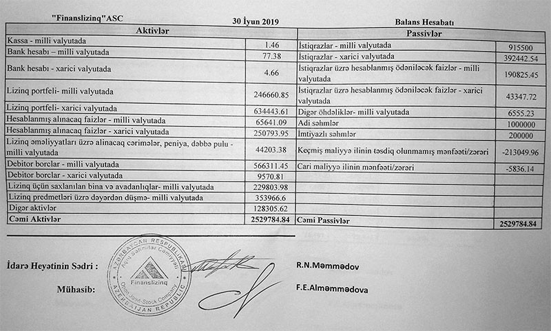 2 milyon 530 min manat cəmi aktivləri olan “Finans Lizinq” 2019-cu ilin 1-ci yarısını 5863 manat zərər ilə başa vurub.