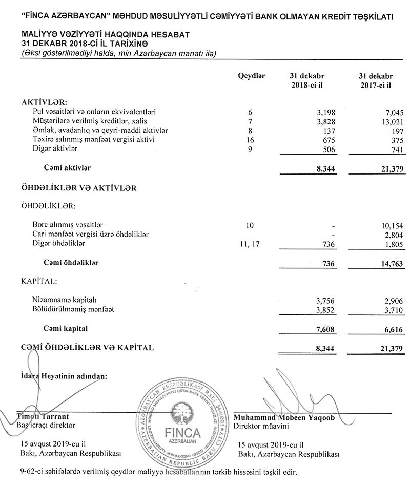 31 Dekabr 2018-ci il tarixində “FINCA Azerbaijan” 8 milyon 344 min manat cəmi aktivlərə, 7 milyon 608 min manat cəmi kapitala və 736 min manat cəmi öhdəliklərə malik olub. 2017-ci ilin sonunda Təşkilat 21 milyon 379 min manat cəmi aktivlərə, 6 milyon 616 min manat cəmi kapitala və 14 milyon 763 min manat cəmi öhdəliklərə malik idi. Əvvəlki illər devalvasiyalara görə böyük ziyana düşmüş “FINCA Azerbaijan” ötən il də 3 dəfəyə yaxın kiçilsə də borclarından xilas olaraq kapitalını bərpa etməsi diqqəti çəkir.