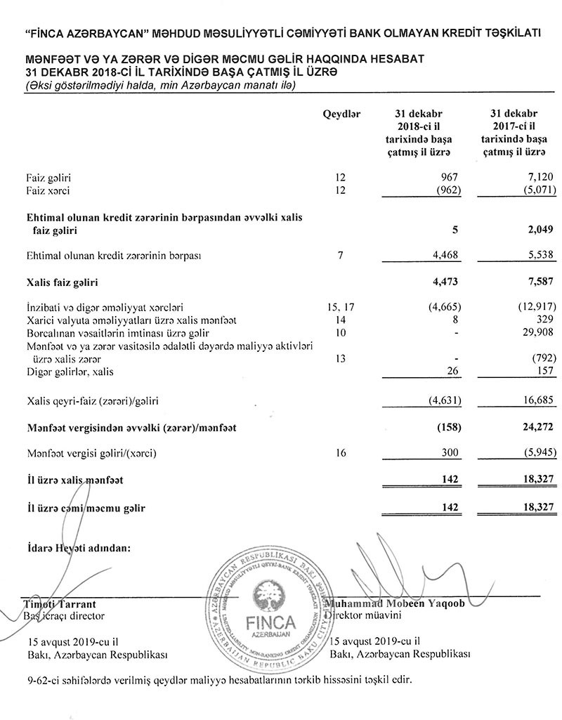 Qeyd edək ki, “FİNCA Azerbaijan” qeyri-bank kredit təşkilatı 2016-cı ildəki 23 milyon 894 min manat zərərdən sonra 2017-ci ili 6 milyon 131 min manat xalis mənfəətlə başa vurmuşdu. Həmin il də mənfəət təşkilatın biznes fəaliyyətindən qaynaqlanmamışdı.